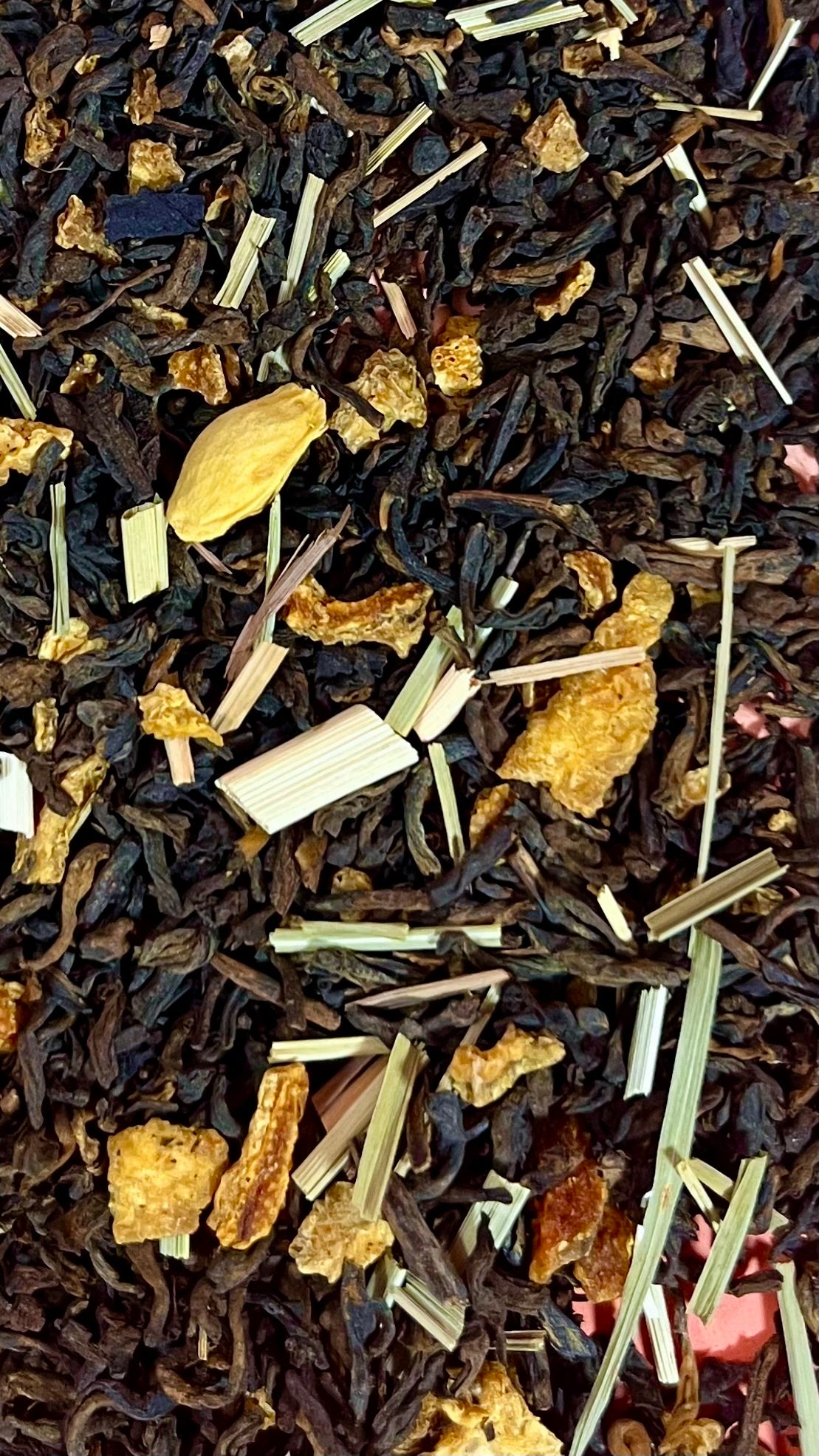 Té rojo Pu erh (82%), cáscara de naranja, cáscara de limón, lemongras, aroma natural.